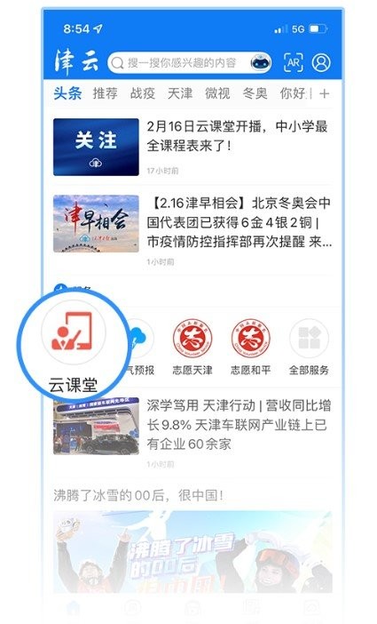 在首页“头条”版块,“服务”区域,点击“云课堂”图标,可以直接观看广电云课堂课程。