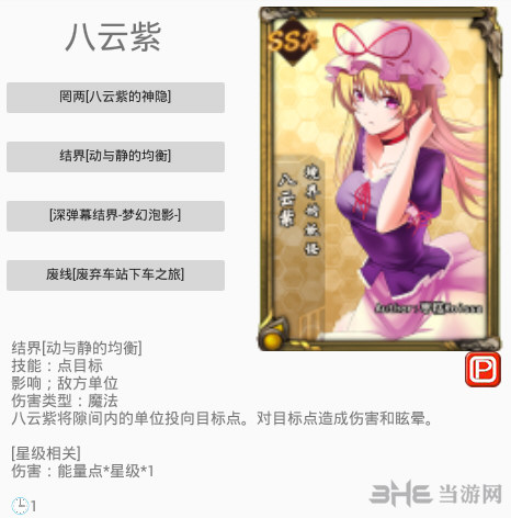 八云紫是一张SSR,有着4个技能,伤害的代表卡之一。当升到五星,这张卡会表现出惊人的清怪能力。