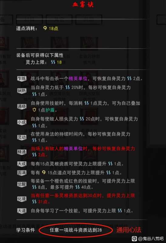 八、通用心法(灵力上限)(此为通用心法,学习条件任意一项战斗资质达到x点)
