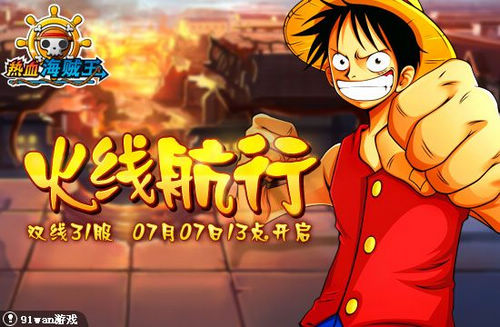 91wan平台最新动漫力作热血海贼王今日重磅出击!著名漫画家尾田荣一郎笔下力作——《海贼王》的故事全面网游化!最热血的航海日志由你来谱写!91wan平台动漫主题大作——热血海贼王,91wan海贼王双线31服“火线航行”即将于2012年7月7日13:00震撼开启!!称霸伟大航道,勇闯新世界!更多玩法,让我们一起来体验一番吧!