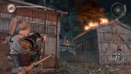 击杀妖鬼,中间道路被火焰覆盖无法通过【火抗高或附近有水桶可以直接淌过火焰】,道路左侧先用弓射杀左侧屋顶上的弓箭手。