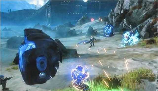 然后我们来到一个很漂亮的发光塔,狙掉上面机枪台的小猪。然后从左面小路清过去,不要心急。屋里有喷子和人类手雷。最后会有一个拿粘雷炮的高级精英,喷掉后捡起它的武器。然后运兵船会运来这个环节最后一波兵,两只隐身精英加两个猎人。找个柱子侯着,等那两个隐身精英过来。盯紧自己的雷达,血低了就绕柱子躲猫猫。