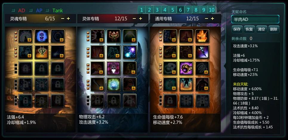 天赋专精醒我喜欢这样点,用一套半肉的天赋,点出双抗成长和双移速,在肉的基础上稍微暴力些,当然也可以把灵魂专精的第二排去掉,点出通用专精最后一排的魔抗,这样就50魔抗出门,前期就能抗,但是缺点是后期成长不够,这就看个人喜好了。