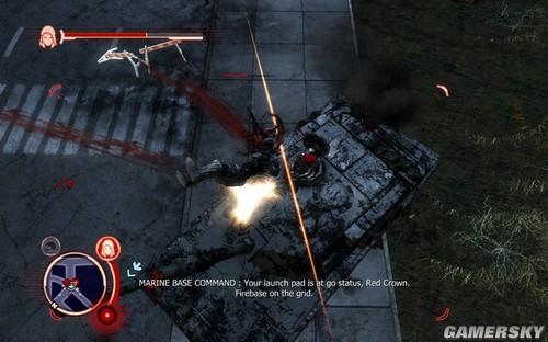 这里又是一系列任务,共三次。每次3~4台坦克。周围的火力很猛,炮塔+火箭兵一大堆。这里最好的方法是用HAMMERFIST ELBOW SLAM,能有效避免周围的攻击,同时对目标造成巨大伤害。(就是换锤子手再跳高砸下的那招)注意不能把那目标坦克毁掉,否则任务失败。