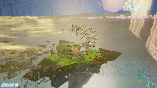 Part2-到通道处时,根据提示骑上“歌利亚石斑鱼”,游过出口,来到很多海草的水域。尽管游戏在水下,但是在海底依然标出了路线,让寻找水潭变得简单了许多。这个区域一共可以发现四个水潭,一个贝壳,一个冥想雕像,三个伙伴。