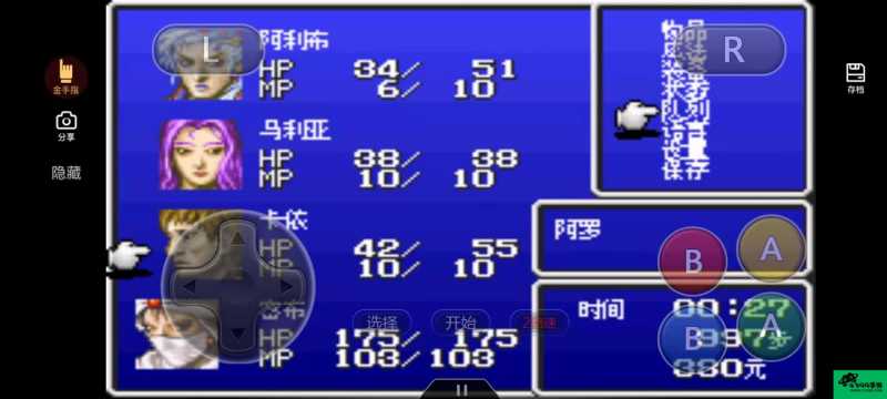 一两个小时后,我们的HP和MP到了这个程度。不要看游戏时间,因为模拟器可以调节速度,我通常是两倍,甚至是八倍。实际的游戏时间绝对不到2个小时。