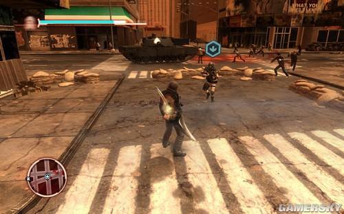 到处都是感染的人群,头顶有红色箭头的士兵就是目标,如果走太开了,可以看小地图找出来。这里要肉搏,上前左右键交替使用,主角的功夫其实还不错的。或者你可以捡起他们的枪,自动锁定,直射就是了。
