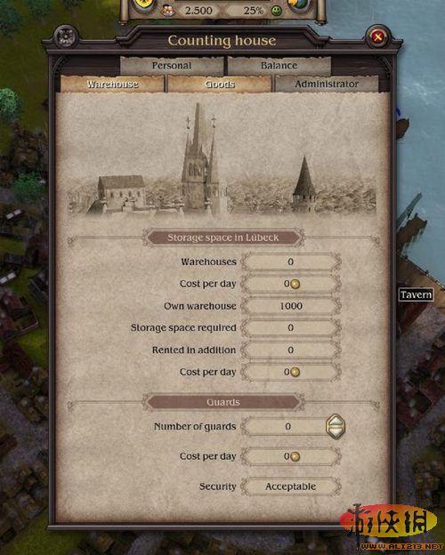 WAREHOUSE显示的是你目前储存货物的花费金额。下面的GUARDS选项则是你可以雇佣一些守卫来守卫你的货物。前期储存的货物少的话可以不用雇佣,后期货物多的话建议雇佣10到20个左右。如果有敌人来攻城的话,建议可以提升到30到50个。你也可以依据下面的SECURTIY来进行守卫的雇佣