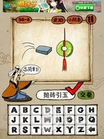《成语玩命猜》56关答案:56-1答案:狗尾续貂GWXD、56-2答案:隔靴搔痒GXRY、56-3答案:狐假虎威HJHW、56-4答案:抛砖引玉PZYY