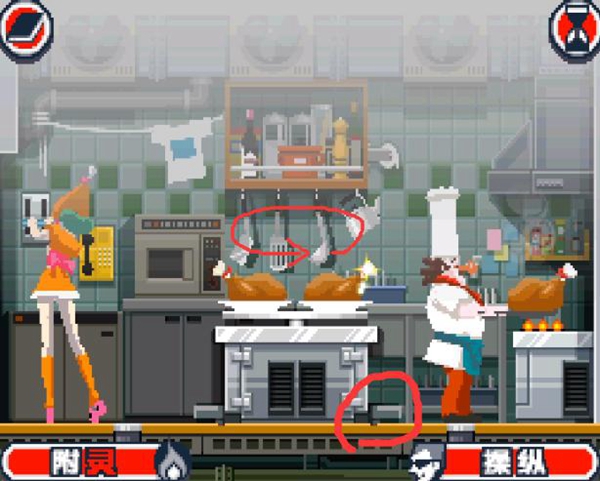 14.操作拉杆后附灵衣服往右挪动,到水壶上等待机会。(大厨在烹饪时有一个拉领带的动作,会让厨师帽后翻,就是时机所在)