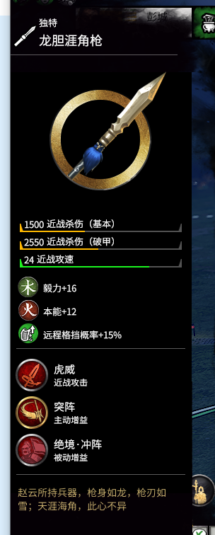 【逆境。龙胆】A+级:这个技能有个很严重的缺陷就是,必须陷入近战才计算冷却时间,也就是一直要在兵海里混,现版本小兵的伤害不低,再硬的武将也抗不了多久的。从青釭剑带的技能可以看到作者一直把金赵云往抗线和单挑上带,不过好在赵云身板硬在自己步兵配合下可以砍翻四方,逆风翻盘技能,因为后期用户一直要面对数倍自己的兵力还要连续作战,所以逆风技能对用户最好的。