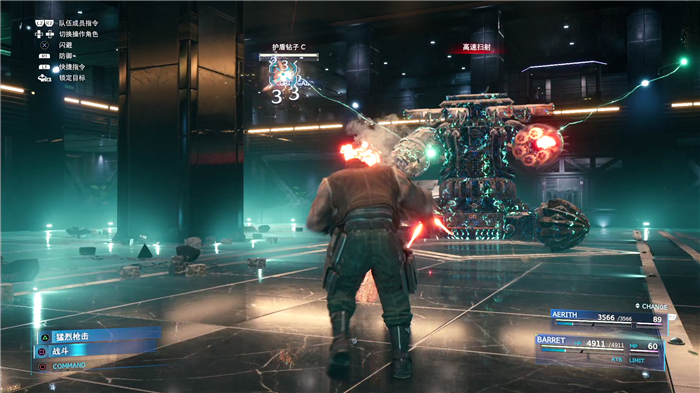 几个回合后,守卫巨蝎会调回原来的位置,进入第三阶段,这里它的攻击会增加蓄力攻击,需要克劳德先到一旁破坏的主机做掩护,等它攻击完毕,立马上前火拼,这里可以用巴雷特远程攻击一点一点的和守卫巨蝎的磨。