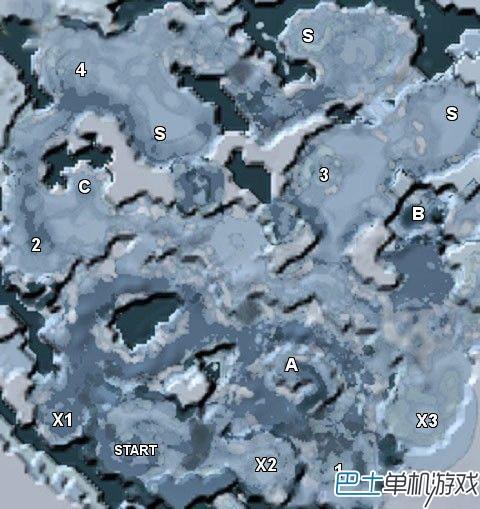 地图(X1、X2)两处着陆点较容易清理,顺道到地图(B)清掉少量军队,摧毁一道奥古斯格勒大门。接着进攻一片小军营(X3),等着第三座酸液炮着陆。地图(X4)的着陆点是一片敌营,需要30只左右的兵力才能搞定。清场后派工兵在地图(1)建立起第二座基地,提升采集和造兵效率,因为地图(X5)的兵营和地图(2)的晶矿有着大量的重甲单位。
